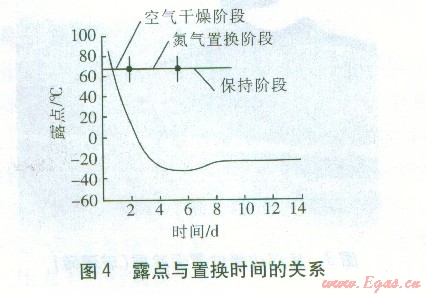 實測結果能否真實地反映實際情況主要取決于置換時間。只要置換時問足夠長,氮氣就能滲透到任何位置,使空氣與氮氣充分混合而被置換。露點與置換時間的關系曲線見圖4。然而對于一個工程來說,置換時間與成本緊密相關,不能無限地追求質量而忽略成本。