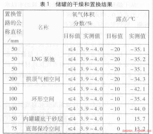 在儲罐首次儲存LNG之前,應對其進行干燥和置換阻[1-3],以降低儲罐內的露點和氧氣含量,防止LNG進入儲罐時與空氣混合引起爆炸。本文對國內某LNG接收站中1座儲氣容積為l6×104m3的儲罐的干燥和置換方法及其結果進行分析,提出一些建議。