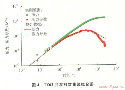 如TZ62井,4704.5~4753.5m井段儲層的沉積環(huán)境主要為砂屑灘、層孔蟲一海綿骨架礁,沉積微相為中高能砂礫屑灘、礁頂一礁坪、礁翼一礁核。巖性主要為淺灰色隱藻泥晶灰?guī)r、泥亮晶生屑砂礫屑灰?guī)r、珊瑚格架灰?guī)r,發(fā)育溶蝕孔洞及高角度裂縫,裂縫被方解石充填。孔隙度介于1.84%~6.2%,、Ⅱ、Ⅲ類儲層均有發(fā)育。該井從2004年3月23日開始一直進(jìn)行試采,酸壓改造后投產(chǎn),雙對數(shù)曲線顯示出明顯的串珠狀特征(圖4)。截至2009年1月5日關(guān)井前,累計產(chǎn)油1.4×104t,累計產(chǎn)氣3125×104m3,呈現(xiàn)出階梯穩(wěn)產(chǎn)特征。