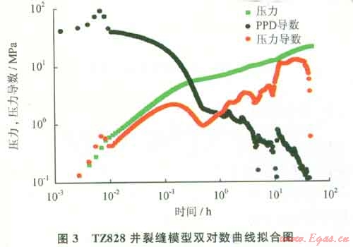 裂縫井模型也是塔中碳酸鹽巖儲層的主要類型之一,此類井由于基質(zhì)孔滲條件差,能量補給不足,相應(yīng)的產(chǎn)能低、遞減快。如TZ828井,5595~5603m儲層的沉積環(huán)境主要為粒屑灘、礁丘亞相,礁翼、中高能砂屑灘微相。巖性生屑砂屑灰?guī)r、層孔蟲骨架巖,含大量棘屑、發(fā)育溶洞、灰色生物礁灰?guī)r、見高角度構(gòu)造縫和蜂窩狀溶蝕孔洞??紫抖绕骄禐?.8%,儲層類型以Ⅰ、Ⅱ類為主。試油期間開井流動曲線近似一條直線,開井期間地面無產(chǎn)出,表明地層無自噴能力;關(guān)井壓力曲線恢復(fù)緩慢,反映儲層為低滲透儲層。二次關(guān)井導(dǎo)數(shù)曲線后期出現(xiàn)不規(guī)則,是由于井筒相變的影響造成的,如圖3所示,試井解釋只能用10h以內(nèi)的數(shù)據(jù)。