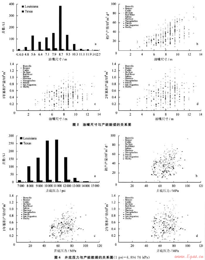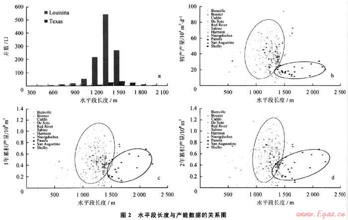2) 水平段長度不是決定產(chǎn)能的唯一因素,也非越長越好。Louisiana和Texas州分別趨向于采用1500m和1650m水平段生產(chǎn)井開發(fā)頁巖氣。