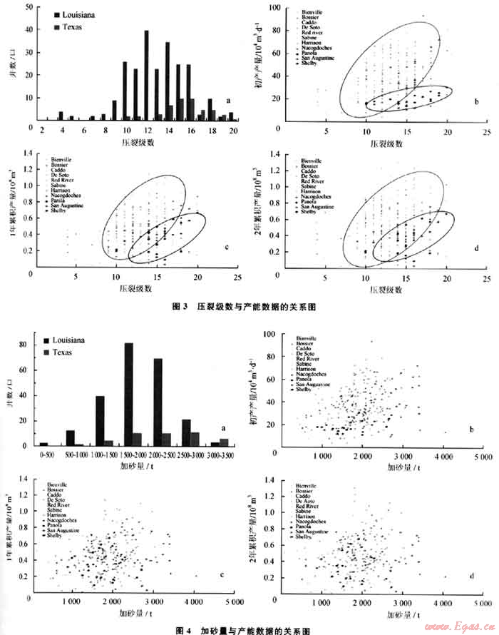上述兩州的加砂量情況上亦不相同。Louisiana州頁巖氣井加砂量多在1500~2500t,Texas州則為1500~3000t。總加砂量的差異主要和頁巖氣井的水平段長度、壓裂級數(shù)和壓裂規(guī)模有關(guān)??傮w上看,加砂量越多產(chǎn)量不一定越好,加砂量與產(chǎn)量的線性關(guān)系最差(圖4)。