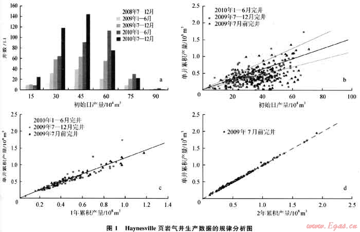 自2007年發(fā)現(xiàn)到2011年10月為止,已鉆頁巖氣井約1500口,日產(chǎn)氣約1.56×108m3,累積產(chǎn)氣量已超過710×108m3。與開發(fā)歷史30年(19812011)、累積產(chǎn)能2550×108m3的Barnett頁巖(14900口井)相比,Haynesville頁巖氣藏?zé)o疑是開發(fā)潛力極大的非常規(guī)能源。