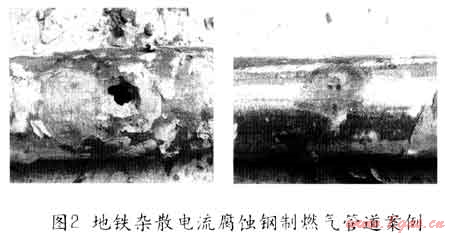 例如,香港曾閃地鐵雜散電流引起煤氣管道腐蝕穿孔,而造成煤’(泄漏事故;北京、天津地鐵中的雜散電流已造成隧道內(nèi)水管腐蝕穿孔;據(jù)東北輸油管理局統(tǒng)計,東北地區(qū)共有長輸油管道約2000km,其中80%的腐蝕穿孔事故來自雜散電流的影響。圖2為某城市鋼制燃?xì)夤艿朗艿罔F雜散電流腐蝕后穿孔的圖片,地鐵雜散電流對金屬管道的強烈腐蝕作用可見一斑。