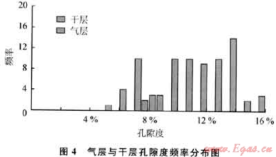 有效孔隙度下限確定有兩種方法:①根據(jù)壓汞資料,分析中值壓力與孔隙度的關(guān)系,當(dāng)孔隙度小于某一值時(shí),中值壓力迅速增大,說明當(dāng)孔隙度小于該值時(shí),汞基本壓不進(jìn),即這部分孔隙基本為無(wú)效孔隙[6~7](圖3),利用該法確定的研究區(qū)有效孔隙度下限為7%;②統(tǒng)計(jì)試油產(chǎn)層段與干層段孔隙度的分布特征來(lái)確定(圖4)。由圖3可知,干層和氣層孔隙度的分界線在7%左右,可見該區(qū)儲(chǔ)層有效孔隙度取7%比較合適。