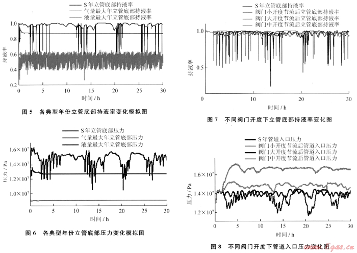 圖5為各典型年份立管底部持液率變化模擬圖。由圖5可知,氣量最大年立管底部持液率基本在0.4~0.6波動(dòng),波動(dòng)范圍很?。灰毫孔畲竽炅⒐艿撞砍忠郝史€(wěn)定在0.9左右,OLGA流型圖顯示管內(nèi)為穩(wěn)定的泡狀流。S年立管底部持液率有很大的波動(dòng),波動(dòng)峰值近0.8,表現(xiàn)出段塞流特征。圖6為各典型年份立管底部壓力變化模擬圖。由圖6可知,氣量最大年和液量最大年立管底部壓力較小,也比較穩(wěn)定,而s年壓力波動(dòng)范圍非常大,段塞流現(xiàn)象嚴(yán)重。此外,根據(jù)計(jì)算結(jié)果,S年立管頂部瞬時(shí)液塞量很大,短時(shí)間內(nèi)可達(dá)150m3,這對(duì)下游分離器的運(yùn)行很不利。