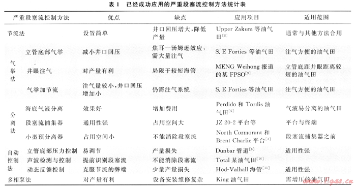 筆者將各種已成功應(yīng)用于油氣田生產(chǎn)的嚴(yán)重段塞流控制方法進(jìn)行了總結(jié),結(jié)果如表1所示。每種控制方法都有一定的適用范圍,隨著流體物性、海底路由、油氣田產(chǎn)量以及下游設(shè)施的不同而不同。應(yīng)針對(duì)不同的工程項(xiàng)目,開(kāi)展具體模擬分析,必要時(shí)可以結(jié)合多種方法來(lái)控制嚴(yán)重段塞流。