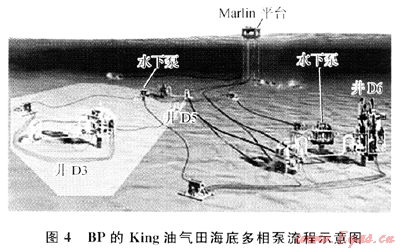 Henriot提出多相泵可用來(lái)消除嚴(yán)重段塞流[7]的方法。2007年英國(guó)石油公司(BP)在GOM的King油氣田水深1676m處安裝并啟用了2臺(tái)海底多相泵,其流程示意圖如圖4所示,在增壓和保證了油氣田產(chǎn)量的同時(shí),也削弱了嚴(yán)重段塞流。