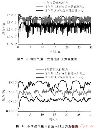 分別采用1.5m3/s和3m3/s的注氣量在立管底部注氣,與不注氣時(shí)對(duì)比得到不同注氣量下立管底部壓力變化如圖9所示,不同注氣量下管道入口壓力變化如圖10所示。