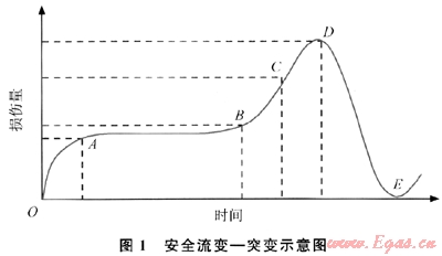 假設(shè)將事物的危險狀態(tài)用損傷程度來表示,那么事物的“安全流變-突變”的全過程可以表述為(如圖1):當(dāng)某一事物誕生后的初期(OA階段),其損傷量在外界力的作用下呈減速遞增,新的狀態(tài)在此期間逐漸形成和完善。當(dāng)新的狀態(tài)發(fā)展到成熟階段時(AB階段),完善的新狀態(tài)使損傷量勻速緩慢增加。當(dāng)經(jīng)過一段穩(wěn)定增加后,原狀態(tài)將再次向無序方向發(fā)展,進而使損傷量值開始加速增大(BC段)。任何事物都有其固有的損傷量承受能力或臨界點(D點),超出此臨界點(D點)后,事物將發(fā)生安全突變。當(dāng)事物的原狀態(tài)遭到破壞后,事物又重新回到一個新的安全狀態(tài),原事物的狀態(tài)消失,從而又形成了另一個同類新事物誕生的新起點(E點)。物質(zhì)世界就是在這種安全與危險的無限循環(huán)中得以存在和發(fā)展的[4]。
