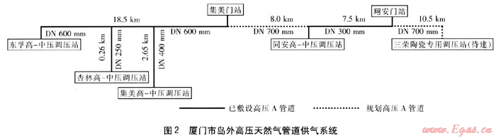 廈門市島外高壓天然氣管道供氣系統(tǒng)見圖2。集美門站作為門站、加氣母站,并提供應(yīng)急氣源;翔安門站作為門站,并提供應(yīng)急氣源。