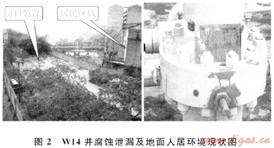 ① 井口裝置存在缺陷;②油層套管固井質(zhì)量較差;③油層套管絲扣滲漏;④完井管柱存在缺陷(未下入永久式封隔器,油管絲扣和工具存在泄漏);⑤防腐工藝措施不到位,油、套管和井口裝置存在腐蝕和滲漏;⑥高含硫氣井存在缺陷,又處于人口密集和環(huán)境敏感區(qū)域,存在高含硫氣泄漏導(dǎo)致環(huán)境污染。如位于人口聚集區(qū)的W14井,H2S含量65.8g/m3,存在井口、井下油套管腐蝕泄漏及硫化氫中毒的嚴重安全隱患(圖2)。