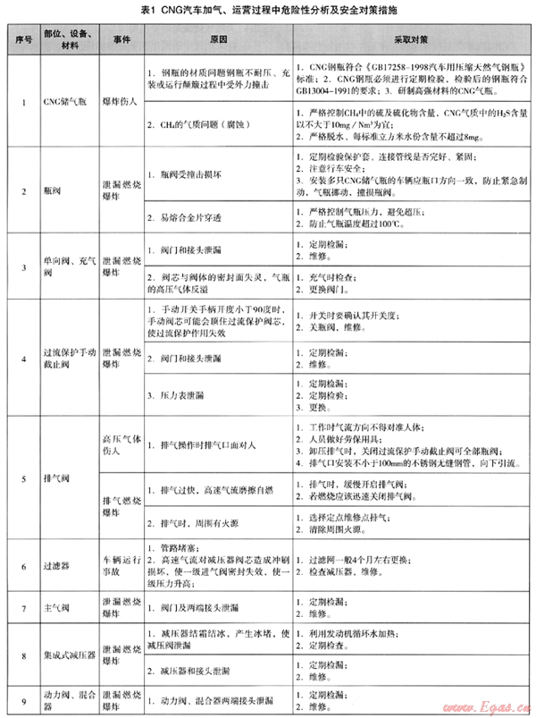 2.6 CNG汽車加氣、運(yùn)營過程中危險性分析見表1。