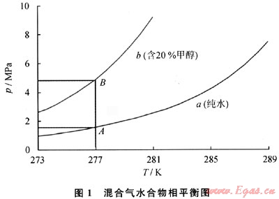 當介質(zhì)中加入一種化學劑時,天然氣水合物形成的平衡條件就會改變,這就是熱力學抑制劑的作用機理。熱力學抑制劑可以使介質(zhì)的相平衡曲線上移,如圖1所示,同一混合氣在加入20%的甲醇后,其生成天然氣水合物的平衡曲線就由a線升高到b線,即當管道的運行溫度為277K時,加入甲醇后,管道中當壓力高于4.85MPa時才會生成天然氣水合物。天然氣水合物生成壓力遠高于加入甲醇前的1.55MPa,這對于天然氣的輸送非常有利。目前2種最主要的熱力學抑制劑甲醇和乙二醇得到了廣泛應用。相對來說,甲醇用得更廣泛,可以用于油氣混輸管道和天然氣管道2種系統(tǒng),且對含鹽高的系統(tǒng)效果更好;而乙二醇一般用于含水非常少的天然氣輸送系統(tǒng)中。可以說熱力學抑制已經(jīng)是目前石油天然氣工業(yè)最主要的天然氣水合物防治手段。