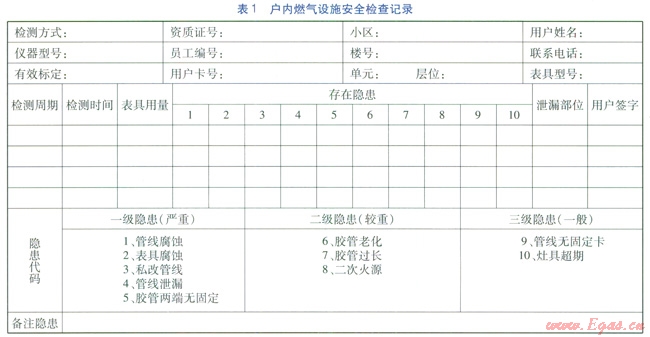 鑒于以上思路,以戶內(nèi)安檢崗位為例,在戶內(nèi)發(fā)生爆炸、爆燃等事故后,相關(guān)部門首先要對燃?xì)膺\營部門是否按國家標(biāo)準(zhǔn)執(zhí)行檢查,是否落實檢查工作等問題進(jìn)行核實,那么核實的依據(jù)就是戶內(nèi)燃?xì)庠O(shè)施安全檢查記錄。我們通常的記錄只有檢查人、地點、時間、存在隱患、處理結(jié)果、處理人及用戶簽字等項目,看起來比較完善,但就筆者來看還是差強(qiáng)人意,只是提供了一些表面證據(jù),沒有體現(xiàn)出更深層面的法律效應(yīng)。例如:我們的員工有沒有檢查資質(zhì),有沒有使用專業(yè)的檢測設(shè)備,檢測設(shè)備是否按時標(biāo)定,設(shè)置在戶內(nèi)的燃?xì)庠O(shè)施有沒有超出使用年限,燃?xì)庠O(shè)施設(shè)置是否保持原始設(shè)計等,都沒有在記錄中體現(xiàn)。燃?xì)膺\營管理者應(yīng)該對其進(jìn)行完善,并在記錄中直觀體現(xiàn),而這幾項問題想要在記錄中得到體現(xiàn)就需要運營企業(yè)投入資金來支撐,要對職工進(jìn)行培訓(xùn)取得資質(zhì),購入檢測設(shè)備并按時標(biāo)定。而燃?xì)庠O(shè)施設(shè)置是否保持原始設(shè)計的問題,筆者認(rèn)為應(yīng)該列入設(shè)備檔案管理,即:對戶內(nèi)安裝的燃?xì)庠O(shè)施形成影像記錄,儲存在計算機(jī)內(nèi),可隨時調(diào)閱來及時掌握燃?xì)庥脩羰欠襁M(jìn)行過更改。戶內(nèi)燃?xì)庠O(shè)施安全檢查記錄見表1。