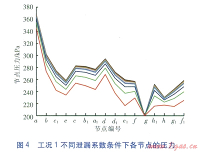 本次TGNET模擬計算的邊界條件如下:氣源點入口壓力最大為400kPa,負(fù)荷點最小壓力不低于200kPa,泄漏點為直徑為20mm的孔洞,并通過對泄漏系數(shù)的設(shè)定模擬不同的泄漏量。本文模擬了泄漏系數(shù)為2.5%、5%、l0%、l2.5%、25%、50%以及100%等7種不同的泄漏情況。