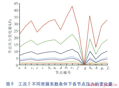 對圖4中的數(shù)據(jù)進(jìn)行處理求得工況l不同泄漏系數(shù)條件下各節(jié)點壓力相對于正常工況壓力的變化量,即正常工況時節(jié)點的壓力減去泄漏工況時節(jié)點的壓力,見圖6。