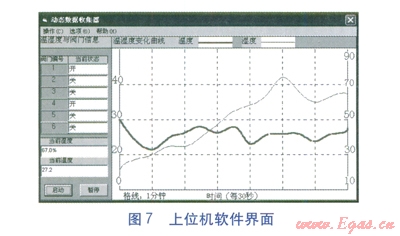 上位機(jī)可以方便地實(shí)現(xiàn)與單片機(jī)之間的交互,實(shí)現(xiàn)操作可視化,更加直觀,便于實(shí)現(xiàn)保存數(shù)據(jù)等功能。上位機(jī)軟件采用Visual Basic 6.0編寫。上位機(jī)軟件界面見圖7。在上位機(jī)的邏輯處理中,可以參照不同的要求,對(duì)溫濕度的處理時(shí)間步長(zhǎng)進(jìn)行人為設(shè)定。步長(zhǎng)越小,調(diào)控越精密,越準(zhǔn)確。反之,步長(zhǎng)越大,調(diào)控較為粗略,但仍可以在人體的舒適范圍內(nèi)。