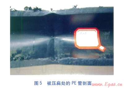 2011年1月,在對de63mm規(guī)格PE管進行壓扁阻斷作業(yè)過程中發(fā)現(xiàn),PE管的復(fù)原情況不理想。隨即,我們對壓扁處PE管進行切割,發(fā)現(xiàn)PE管內(nèi)壁損傷嚴(yán)重,壓扁處出現(xiàn)明顯減薄并出現(xiàn)裂紋,被壓扁處的PE管剖面見圖5。