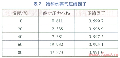 我公司橋東煤氣儲(chǔ)配站的人工煤氣來(lái)自邢臺(tái)旭陽(yáng)焦化有限公司,經(jīng)過(guò)脫萘、脫硫凈化處理后,主要組成見(jiàn)表l。經(jīng)站區(qū)流量計(jì)計(jì)量,進(jìn)入管網(wǎng),輸送至用戶,日均供氣量為17×104m3d左右,用氣高峰期可達(dá)24×104m3d。主干管采用DN 600mm的螺旋焊縫鋼管,長(zhǎng)度約l0km,管網(wǎng)運(yùn)行壓力為3070kPa。在計(jì)量處測(cè)人工煤氣溫度,經(jīng)統(tǒng)計(jì),濕煤氣的溫度不超過(guò)50℃,處于水飽和狀態(tài)。表2080℃的飽和水蒸氣壓縮因子值[1]。由表2可知,當(dāng)溫度不超過(guò)80℃,水蒸氣的飽和蒸氣壓很低,飽和水蒸氣壓縮因子與l的偏差小于1%,趨于理想氣體性質(zhì)。