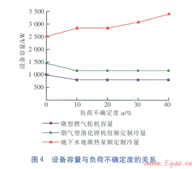 在上述5種工況的優(yōu)化配置方案中,各種設(shè)備的優(yōu)化容量與負(fù)荷不確定度的具體關(guān)系見(jiàn)圖4,其中,溴化鋰機(jī)組和熱泵機(jī)組僅給出了額定制冷量。由圖4可以看出,隨著負(fù)荷不確定度a的增加,地下水地源熱泵機(jī)組的額定制冷量因考慮極限工況而逐漸增大,而微型燃?xì)廨啓C(jī)發(fā)電機(jī)組和煙氣型溴化鋰機(jī)組的容量在考慮負(fù)荷不確定性后反而有所減小。這是因?yàn)轸敯魞?yōu)化配置避免了在負(fù)荷需求偏小時(shí)出現(xiàn)由于所有設(shè)備容量均增大而引起的年總費(fèi)用后悔值增大的情況,從而降低了系統(tǒng)的優(yōu)化配置方案在實(shí)際運(yùn)行時(shí)的經(jīng)濟(jì)風(fēng)險(xiǎn),使其更具經(jīng)濟(jì)魯棒性。