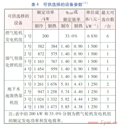系統(tǒng)可供選擇的設(shè)備參數(shù)見(jiàn)表4。在計(jì)算中,貸款年利率取5.94%,設(shè)備的使用年限統(tǒng)一取l5a。分時(shí)電價(jià)為:10001500、18002100為峰段,電價(jià)l.0125元/(kW·h);2300700為谷段,電價(jià)0.3535(kW·h);700—1000、15001800、21002300為平段,電價(jià)0.6725元/(kW·h)。氣價(jià)取l.85元/m3,天然氣低熱值取35.2 MJm3。燃?xì)廨啓C(jī)模型中的系數(shù)取值見(jiàn)文獻(xiàn)