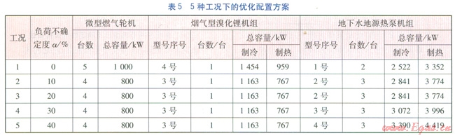由表5可以看出,在傳統(tǒng)的不考慮負(fù)荷不確定性的優(yōu)化配置結(jié)果中,即在工況l下,發(fā)電機(jī)組臺(tái)數(shù)為5臺(tái);而在考慮負(fù)荷具有l0%~40%不確定度時(shí),優(yōu)化配置程序給出的發(fā)電機(jī)組臺(tái)數(shù)為4臺(tái);煙氣型溴化鋰機(jī)組的容量與燃?xì)廨啓C(jī)排煙中的可利用余熱量有關(guān),地下水地源熱泵機(jī)組的容量因考慮極限工況而與最大冷、熱負(fù)荷有關(guān)。