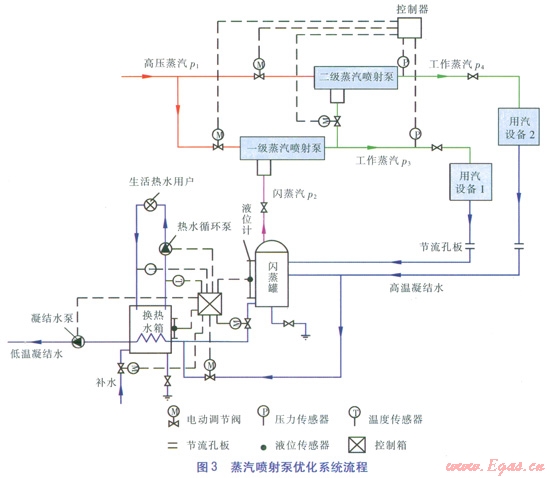 優(yōu)化系統(tǒng)與基本系統(tǒng)比較,采取了以下改進措施:增加了二級蒸汽噴射泵,滿足不同壓力等級用汽設(shè)備的需求。利用凝結(jié)水余熱加熱生活熱水。采用節(jié)流孔板代替疏水閥。完善了自動控制系統(tǒng),可適應(yīng)用汽設(shè)備變負(fù)荷工況需求。