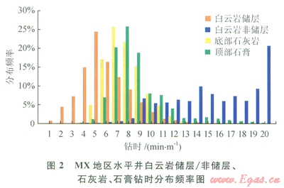 鉆時(shí)是儲(chǔ)層判別的重要參數(shù)。根據(jù)區(qū)域水平井資料,對目的層及其圍巖的鉆時(shí)進(jìn)行了統(tǒng)計(jì)分析。