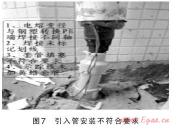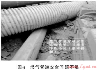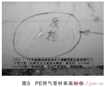在燃?xì)夤艿朗┕み^程中,因施工單位人員、現(xiàn)場監(jiān)理人員以及建設(shè)單位現(xiàn)場管理人員對燃?xì)夤艿腊惭b施工質(zhì)量監(jiān)管不到位,施工經(jīng)驗(yàn)不足或者根本不懂燃?xì)夤艿朗┕さ闹匾?,不按照燃?xì)庑袠I(yè)國家規(guī)范和行業(yè)標(biāo)準(zhǔn)嚴(yán)格操作和監(jiān)管,產(chǎn)生一系列施工質(zhì)量隱患。如鋼管防腐處理不到位、閥井內(nèi)波紋補(bǔ)償器受外力安裝偏斜或不同軸,電熔管件焊接焊口冷卻采取沖水冷卻方式,PE管道運(yùn)輸、搬運(yùn)造成管壁劃傷嚴(yán)重超標(biāo)等人為因素,給城市燃?xì)夤艿腊踩\(yùn)行種下了一顆顆定時(shí)炸彈(如圖3、4、5)。