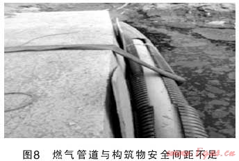 主要表現(xiàn)在:1)對壓力管道安全知識(shí)缺乏和對壓力管道有關(guān)介質(zhì)(如液化石油氣和天然氣)安全知識(shí)貧乏;2)對安全距離重視不足,壓力管道與其它設(shè)施距離不符合規(guī)范(GB50028-2006)相關(guān)要求,壓力管道與生活設(shè)施安全距離不足;3)無安全操作制度或有規(guī)定要求不嚴(yán)格執(zhí)行(如圖6、7、8)。