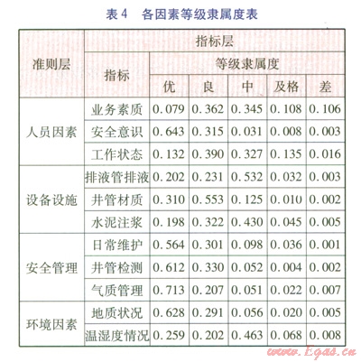 本研究中,研究人員對CNG地下儲氣井的安全評價除了一般性的理論分析外,還建立了指導(dǎo)地下儲氣井安全評價的模糊層次分析模型。該模型的優(yōu)點是:用層次分析法建立各種安全因素指標集,避免了確定權(quán)重時的主觀片面性;綜合模糊數(shù)學理論與層次分析法,將定性分析與定量分析相結(jié)合,使主觀估計客觀化,尋求到了理論分析與工程實際的結(jié)合點;采用比較成熟的模糊層次分析法進行評價,較好地解決了工程項目中模糊因素的度量[9]。