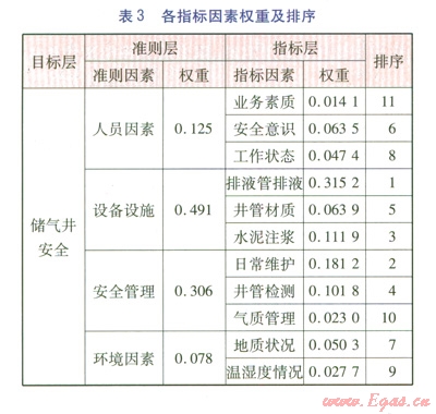 匯總各準則層因素與指標層因素對于儲氣井安全目標的權(quán)重,即可以排出各指標因素對儲氣井安全權(quán)重的順序。以某CNG地下儲氣井為例,利用層次分析法,把相關(guān)各指標因素進行綜合評定,并且進行歸一化處理,見表3。