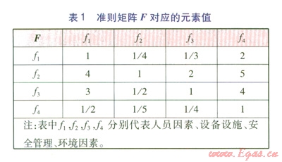 此處利用方根法計算,用兩兩比較求出各元素的相對重要程度,其準則矩陣F對應(yīng)的元素值見表1。