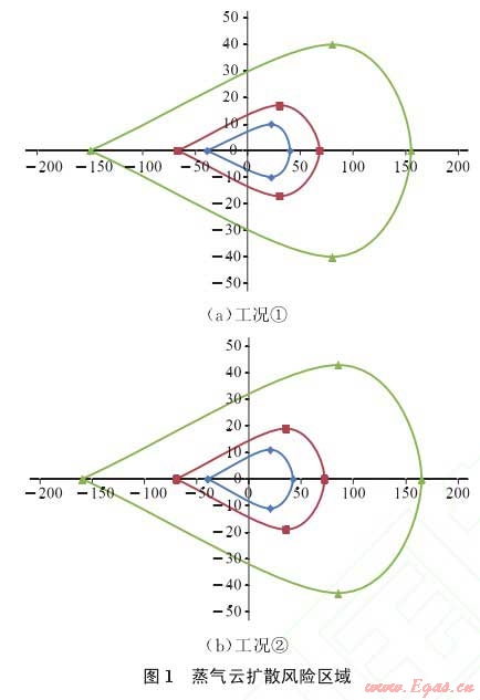 2,用時(shí)分別為27s1162.3s,低于該熱流值時(shí)人員不會死亡、木質(zhì)結(jié)構(gòu)不會損壞。為此,危險(xiǎn)輻射強(qiáng)度取15.77kW/m2,兩種工況下噴射火的危險(xiǎn)半徑分別為45m50m。