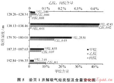 渝頁1井提撈的黑色巖心均為不含地層水的“干層”,即不含地層水(包括束縛水)的含氣層,若將隨機(jī)選取的巖心置于水中,則均將發(fā)生針尖狀氣泡不斷溢出的現(xiàn)象,視為頁巖氣的最直接證據(jù);此外,在鉆進(jìn)過程中,還多次在井筒中發(fā)現(xiàn)了氣泡溢出以及井口空氣中甲烷含量異常等現(xiàn)象,證實(shí)了頁巖中天然氣的直接存在。同時,渝頁1井的16塊樣品現(xiàn)場解析表明,位于281.Om和287.5m井深處樣品的含氣量現(xiàn)場解析值最高,計算現(xiàn)場解析氣量達(dá)到并超過0.1m3/t(解析持續(xù)時間為6h)??紤]到井筒提心時間較長(4.2h)、損失氣量及殘留氣量較多等原因,再結(jié)合已有解析曲線的比較研究,推測頁巖吸附含氣量大于1.0m3/t。結(jié)合頁巖總含氣量分析原理,初步計算頁巖總含氣量(吸附氣+游離氣)介于1.0~3.Om3/t之間,視為具有工業(yè)價值的頁巖氣。進(jìn)一步的色譜分析結(jié)果表明,天然氣樣品中同時含有甲烷和乙烷,在128.23~138.46m和206.75~209.18m井深等樣品中還發(fā)現(xiàn)了丙烷的存在(圖5)。其中,138.13~138.46m井深樣品中的甲烷、乙烷和丙烷含量分別為42.43%、0.42%、0.01%,其余為N2、CO2和O2等大氣成分。解吸樣品中烴類氣體含量的百分比并不高,可能主要反映為解析儀中空氣樣品的殘留或地下風(fēng)化帶中少量空氣成分的進(jìn)入。