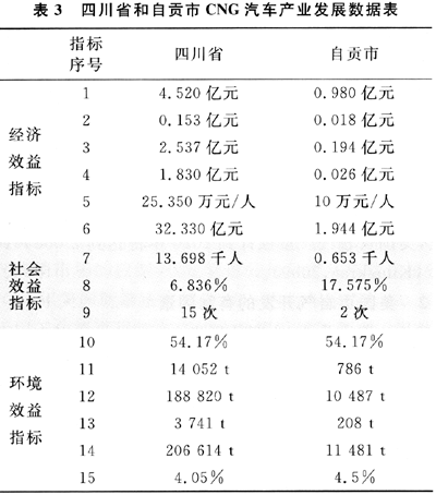 筆者根據(jù)本課題研究收集到的2007年自貢市和四川省數(shù)據(jù)為基礎(chǔ),以四川省為評(píng)價(jià)參照對(duì)象,對(duì)自貢市CNG汽車產(chǎn)業(yè)發(fā)展的綜合效益進(jìn)行評(píng)價(jià)。
