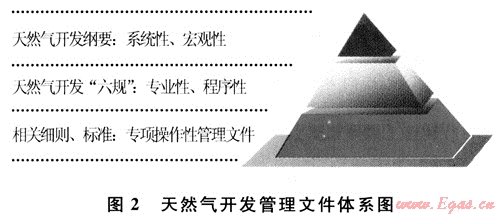 在借鑒國外天然氣開發(fā)理念和總結(jié)數(shù)十年開發(fā)經(jīng)驗(yàn)教訓(xùn)的基礎(chǔ)上,編制并頒布實(shí)施《天然氣開發(fā)管理綱要》,并構(gòu)建了以該《綱要》為主的3個層次天然氣開發(fā)管理文件體系(見圖2):①系統(tǒng)性、宏觀性的管理文件;②專業(yè)性、程序性的管理文件;③專項(xiàng)操作性的管理文件。管理文件體系的建立,對天然氣開發(fā)全過程提出明確要求,進(jìn)一步規(guī)范了天然氣開發(fā)各項(xiàng)管理工作,理順各專業(yè)管理工作界面和關(guān)系,明確了氣田開發(fā)各階段的主要工作內(nèi)容、程序和技術(shù)要求,形成不同層次管理人員和各環(huán)節(jié)現(xiàn)場操作人員操作程序與技術(shù)標(biāo)準(zhǔn)。天然氣開發(fā)全面實(shí)現(xiàn)制度化、科學(xué)化、全過程可控化管理。