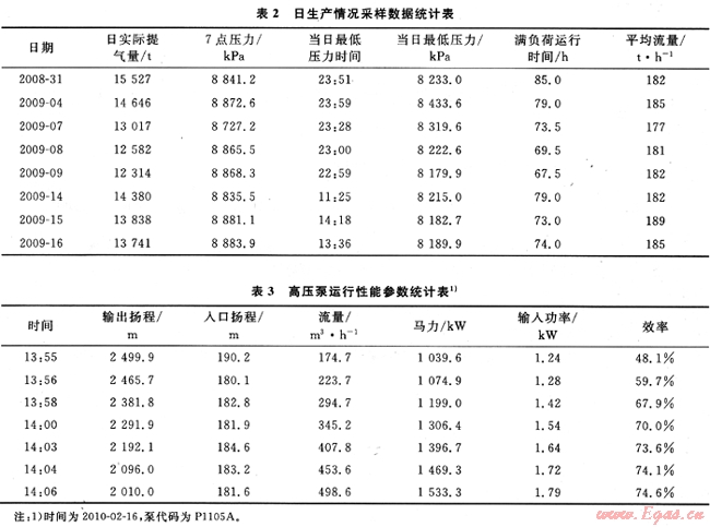 1) 繼續(xù)適量增大生產(chǎn)線的氣化能力。表2為日生產(chǎn)數(shù)據(jù)統(tǒng)計(jì)表,由表2可知,單臺(tái)氣化裝置的平均輸出流量基本在180t/h左右,如果ORV的海水進(jìn)出口溫差小于5℃,增加高壓泵的流量可繼續(xù)增加氣化生產(chǎn)線的氣化能力。表3為高壓泵運(yùn)行性能參數(shù)統(tǒng)計(jì)表。由表3可知,在流量為500m3/h時(shí),高壓泵的功率在額定功率1800kW以內(nèi)。如果將氣化設(shè)備低壓泵、高壓泵和0RV的流量分別運(yùn)行在500、450、430m3/h左右,設(shè)備仍運(yùn)行在最佳效率區(qū)間且運(yùn)行參數(shù)正常。