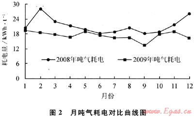 圖2為2008年和2009年LNG接收站月噸氣耗電對(duì)比圖,2009年的月平均噸氣耗電指標(biāo)相應(yīng)下降,但年度用氣高峰階段5~11月份的下降幅度低于12~4月份年度用氣低谷階段。