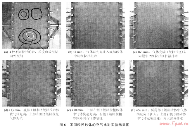 最終的實(shí)驗(yàn)結(jié)果是3個(gè)相對(duì)高滲砂體中含氣,而周圍的細(xì)砂中含水,尤其值得注意的現(xiàn)象是,在最底部的相對(duì)粗砂中雖然充滿了氣,但其中的細(xì)砂仍然含水。