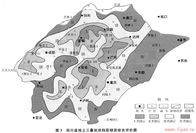 須二段主要分布Ⅱ、Ⅲ類儲(chǔ)層,Ⅰ類儲(chǔ)層分布較少,只是零星分布。整個(gè)四川盆地為低孔低滲儲(chǔ)層類型,因此Ⅰ類儲(chǔ)層分布面積小,主要分布在有利成巖相、裂縫發(fā)育帶及優(yōu)勢(shì)沉積微相疊合處,如川中的廣安、潼南、八角場(chǎng)及荷包場(chǎng)地區(qū);Ⅱ類儲(chǔ)層分布面積大,主要分布在充深、磨西、威東、通賢、中壩、川西南等地區(qū);Ⅲ類儲(chǔ)層分布主要在川西南與川中過渡帶之間。