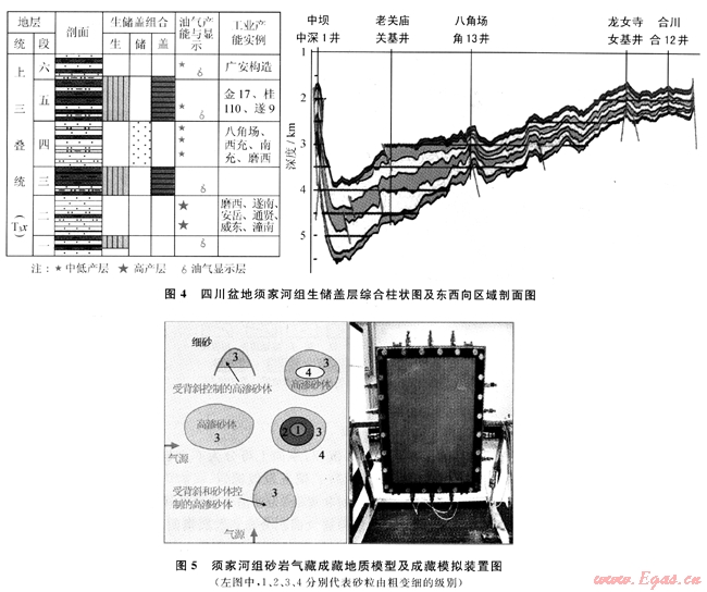 3) 綜合分析須家河組氣源巖、生儲(chǔ)蓋層空間配置等油氣地質(zhì)條件,評(píng)價(jià)烴源巖生烴潛力。結(jié)合氣藏解剖,首次開展氣水置換的成藏模擬試驗(yàn),認(rèn)為砂巖儲(chǔ)層物性的相對(duì)差異是能否聚氣的關(guān)鍵。