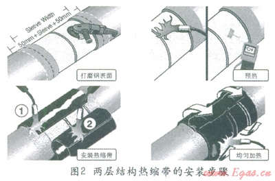 兩層結(jié)構熱縮帶施工簡單,只需要對海管節(jié)點裸鋼表面進行打磨、預熱就可以安裝熱縮帶了。安裝過程只需要將熱縮帶纏繞在節(jié)點上,按要求均勻加熱,熱縮帶就會收縮,緊緊的固定在節(jié)點鋼表面上。一般只需要占用鋪管作業(yè)線的一個站點,兩個人用五分鐘左右就可以完成一個節(jié)點的防腐施工。