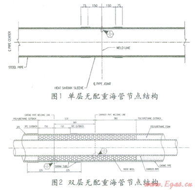 不同結(jié)構的海管也有多種不同結(jié)構的節(jié)點,無配重海管的普通節(jié)點結(jié)構如圖l、2所示。此外常見的海管還有單層配重管、單層保溫管、雙層配重管等多種結(jié)構。