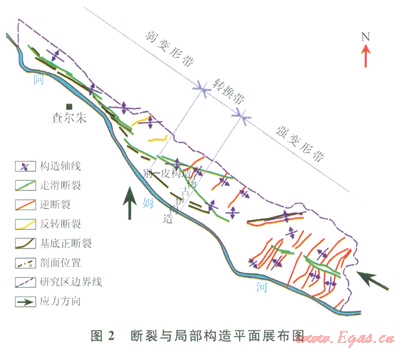 東部強(qiáng)變形帶指基薩爾褶皺隆起區(qū)和別什肯特坳陷,構(gòu)造以逆掩斷裂背斜構(gòu)造帶為主?;_爾褶皺隆起區(qū)構(gòu)造變形強(qiáng)度最大,逆掩斷裂發(fā)育(圖2),愈靠近強(qiáng)烈活動的斷層,褶皺變形越明娩,并且臨近逆沖斷層—翼陡傾不對稱。逆沖斷裂平面呈北東走向的“S”形,另有一組北西西向走滑斷裂,切割北西走向的逆沖斷裂構(gòu)造帶。別什肯特坳陷逆掩斷裂背斜帶呈狹長線形,走向北東,控制構(gòu)造的主控斷層斷距和構(gòu)造幅度較基薩爾褶皺隆起區(qū)小。