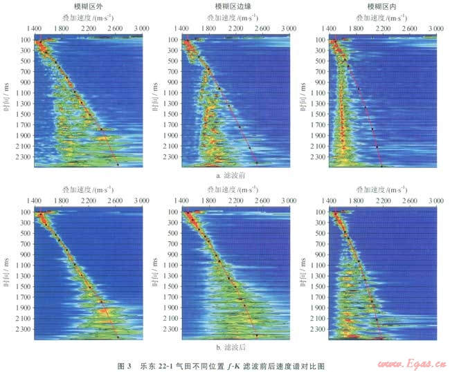 基于上述認識,加強了對全區(qū)的地震速度譜的解釋分析。分析發(fā)現(xiàn)“模糊區(qū)”外速度譜能量團集中,質量較好,解釋可靠;進入“模糊區(qū)”后,速度譜質量明顯降低,看不到一次波的能量團,特別是中心部位只有多次波的能量團出現(xiàn),無法進行速度解釋(圖3)。分析認為該區(qū)淺層氣十分發(fā)育,淺層氣與其圍巖的波阻抗差別很大,從而形成很強的反射。淺氣層與淺氣層之間、淺氣層與海底之間就產(chǎn)牛了很強的層間多次波,致使在地震速度譜上一次波的能量被掩蓋,譜上顯示出的全是多次波的能量團。因此壓制多次波便成為精細速度分析的首要任務。經(jīng)過多次試驗,f-K濾波。叫對壓制本區(qū)的多次波效果較好(圖3)。經(jīng)濾波處理后,“模糊區(qū)”外正常地層的速度譜能量團更清楚;剛進入“模糊區(qū)”的速度譜也出現(xiàn)了較集中的一次波的能量團,能夠準確地進行解釋;“模糊區(qū)”中心的速度譜雖然仍有較強的多次波能量團出現(xiàn),但一次波的能量團已清楚地出現(xiàn)在速度譜上,完全可以進行可靠的速度解釋。