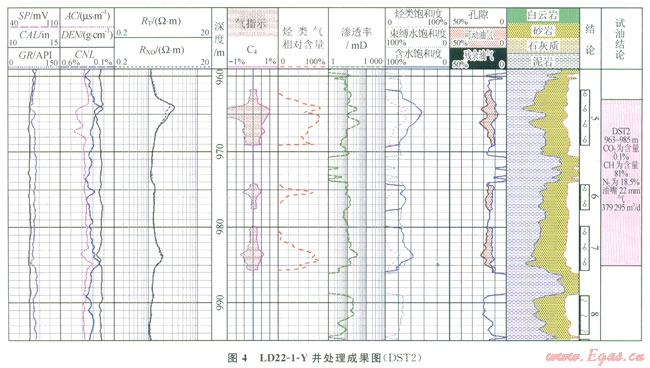 4顯示LD22-1-Y963985m段測(cè)井定量計(jì)算烴類氣含量為75%左右,測(cè)試證實(shí)該層甲烷含量為81%。通過鶯歌海盆地l5口井19個(gè)層位測(cè)井計(jì)算烴類氣含量與實(shí)測(cè)結(jié)果對(duì)比,在統(tǒng)計(jì)的l9層中,絕對(duì)誤差在20%以內(nèi)的層有l5層,占79%;絕對(duì)誤差在10%以內(nèi)的層有l2層,占63[13]。表明該定量方法能較為有效地計(jì)算烴類氣含量,從而達(dá)到區(qū)分烴類氣與非烴氣的目的。