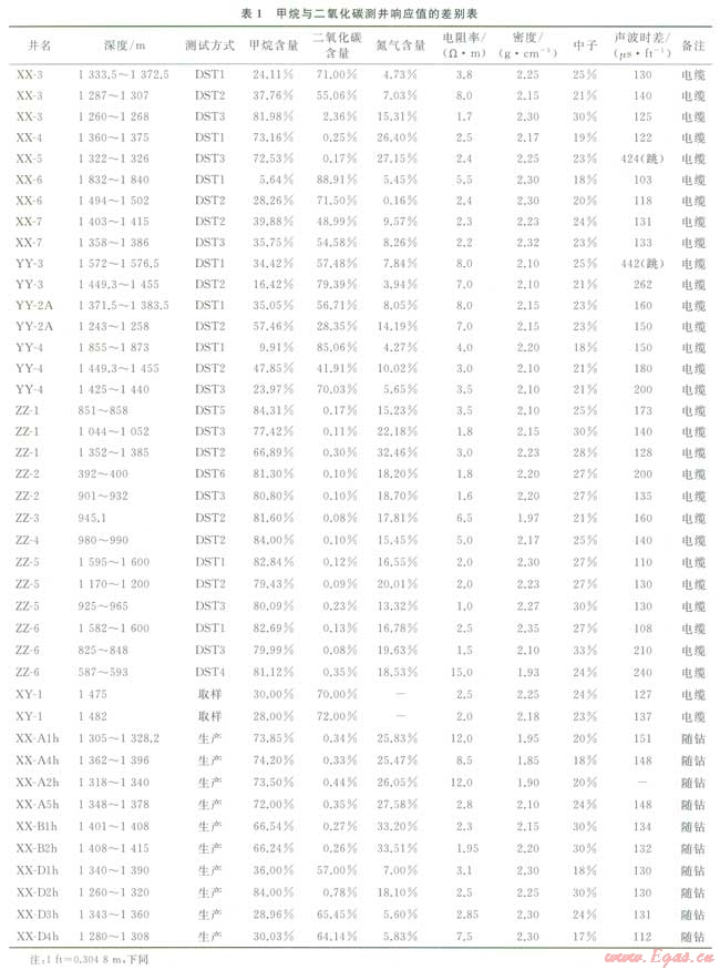 烴類氣與二氧化碳?xì)鈱釉跍y(cè)井曲線上的響應(yīng)特征與油、水層有較明顯的區(qū)別,而它們兩者之間的差異卻較小,這是造成用測(cè)井資料區(qū)分甲烷和二氧化碳困難的根本原因。但通過對(duì)二者理論上測(cè)井響應(yīng)值的研究可知,兩者還是存在一定的差別,因而兩種氣體在測(cè)井曲線上必定存在或多或少的差異,這是用測(cè)井資料定性、定量區(qū)分烴類氣與二氧化碳?xì)獾幕A(chǔ)[4]。