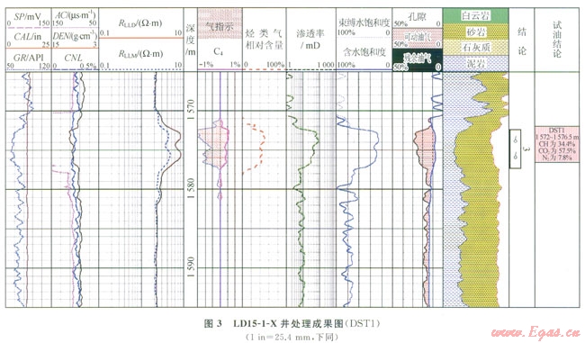 3顯示LDl5-1-X15721577m段第2道中子密度出現(xiàn)交會(huì),第3道電阻率增大,第5道孔隙度差、比值識(shí)別法出現(xiàn)明顯的氣層“包絡(luò)”特征,第8道測(cè)井計(jì)算的含水飽和度與束縛水飽和度幾乎重合,含水飽和度大致為30%,第6道為該方法定量計(jì)算出的烴類氣相對(duì)含量,大概在40%左右,DST測(cè)試證實(shí)該層甲烷含量為34.4%,測(cè)試的結(jié)果與定量計(jì)算的結(jié)果相近。
